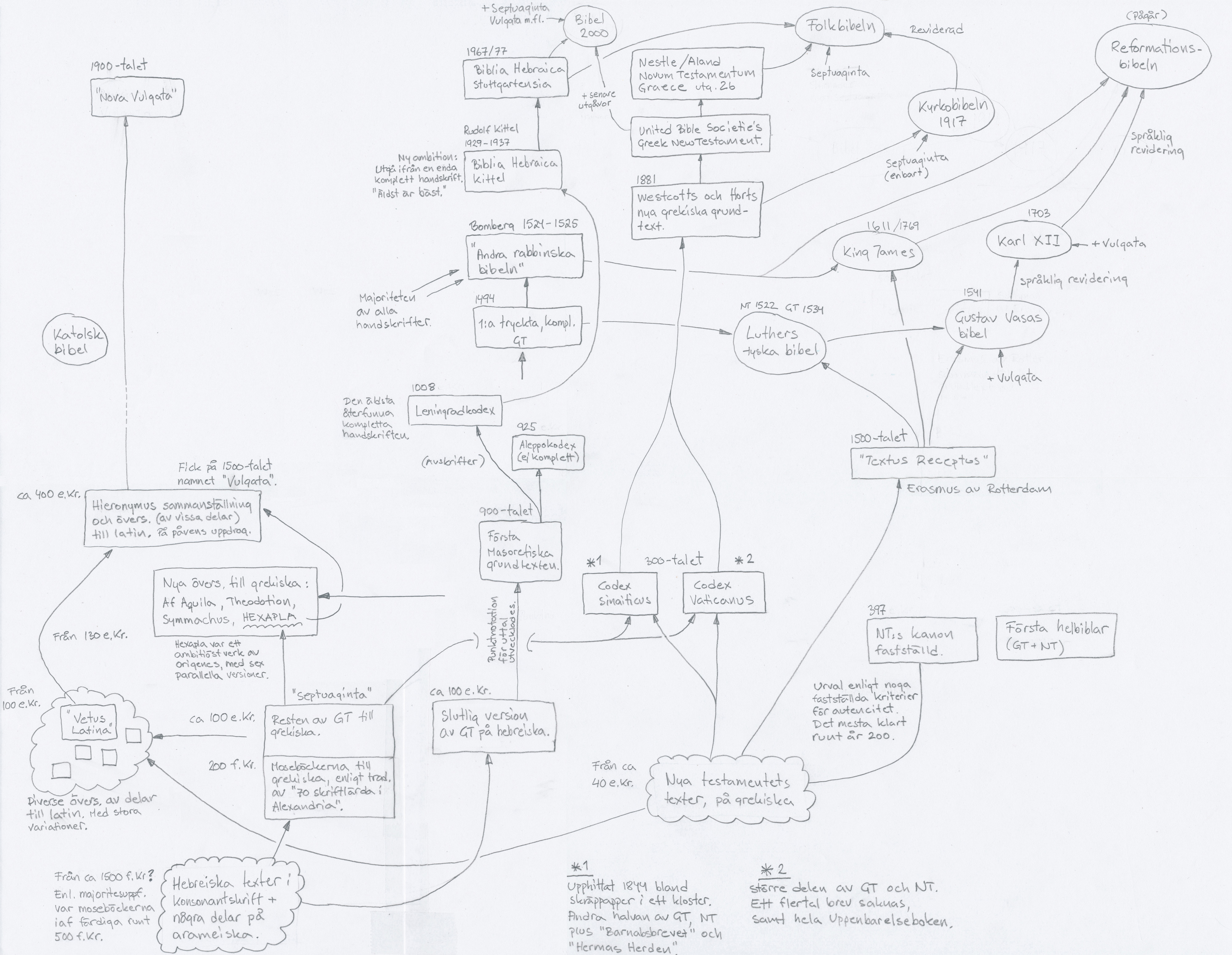 Lite längre ner på den här sidan finns en bild, en grov översikt som jag i första hand gjorde för min egen förståelse. Som du ser av den finns det mycket att säga om hur Bibeln kommit till. Turerna är många, och när man inser hur krokig vägen varit från de antika grundtexterna till dagens bibelöversättningar, är det kanske inte så konstigt om texternas autencitet och auktoritet ifrågasätts. Framför allt finns en konflikt mellan den traditionella synen på Bibeln som helig, gudsinpirerad text, och den mer akademiska, där Bibeln analyseras på samma sätt som andra antika verk av mänskliga författare. Till det kommer att troende inte själva alltid är överens om vilka texter som är de mest ursprungliga och korrekta. Och därmed inte heller vilka moderna bibelöversättningar som kan sägas vara ”Guds ord”.